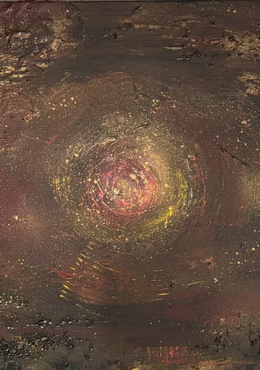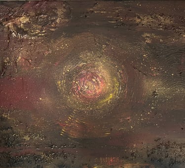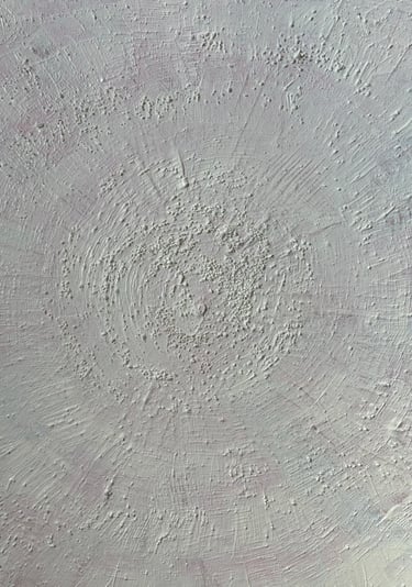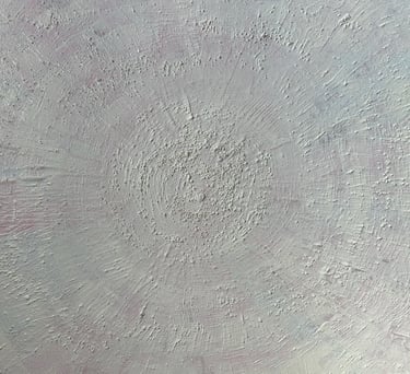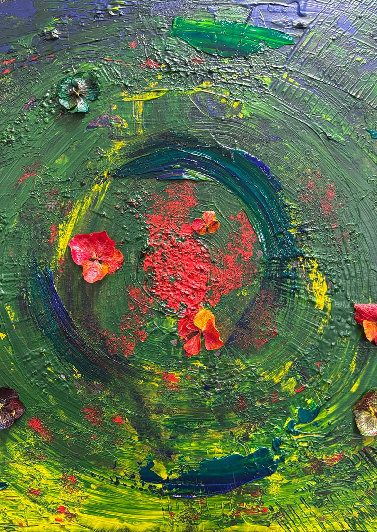 In de schilderijen zijn natuurlijke materialen als aarde, edelstenen, veren en bloemen verwerkt